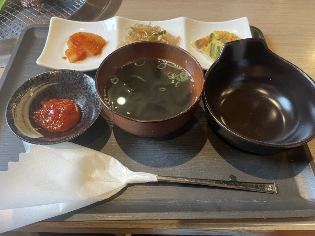 ハラミ、ご飯、スープ、サラダ、そしてチヂミ