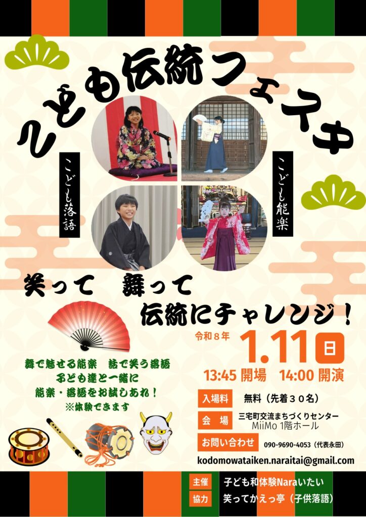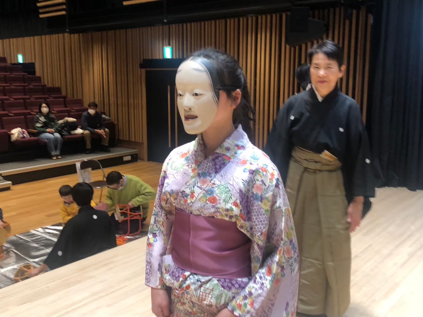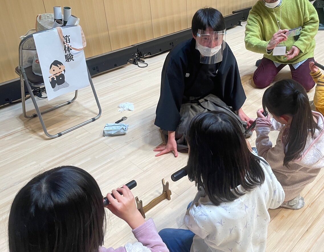 能楽師による実演や伝統体験(小鼓・大鼓・太鼓・笛・能面・落語)で身体で体験できる